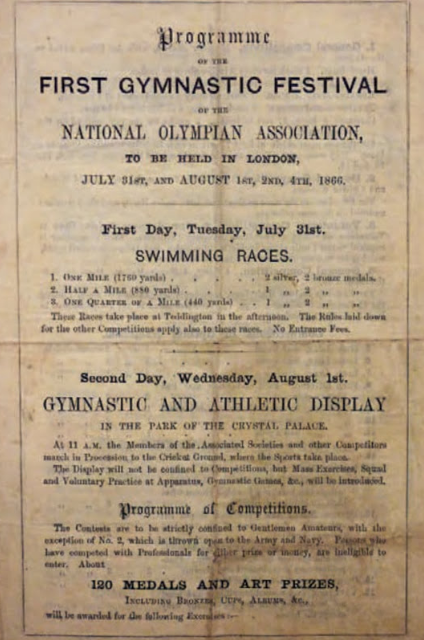 Reported as the “First Great Gathering of the National Olympian Association” attracted crowd of around 10,000 spectators. The young WG Grace won the 440yard hurdles in 1m 10s at Crystal Palace game. Notably, this was in the same week he was playing cricket for England, in a match against Surrey at the Oval, and scoring 224 runs not out. The National Olympian Games included Swimming, Gymnastics, athletics, wrestling, boxing, fencing. First day had swimming at Teddington on 31st July 1866, with indoor events in German Gymnasium (Kings Cross) on the 3rd day of the Games. The first National Olympian Games outdoor events included the “Gymnastic and Athletic Display in the Park of the Crystal Palace”, 1st August, 1866.