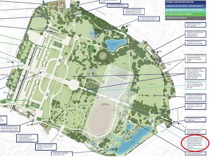 See the Crystal Palace Park Regeneration Plan – Exhibition Boards May 2017.pdf report