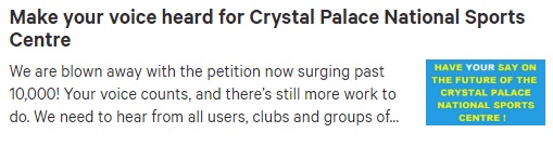 Save Athletics and Sports at Crystal Palace petition passes 5,500! Keep sharing so the Mayor of London knows how important the NSC and all its multi-use sports and event facilities indoors and outside, 50m pool, diving and training pool, and athletics tracks are for Londoners of all abilities.
