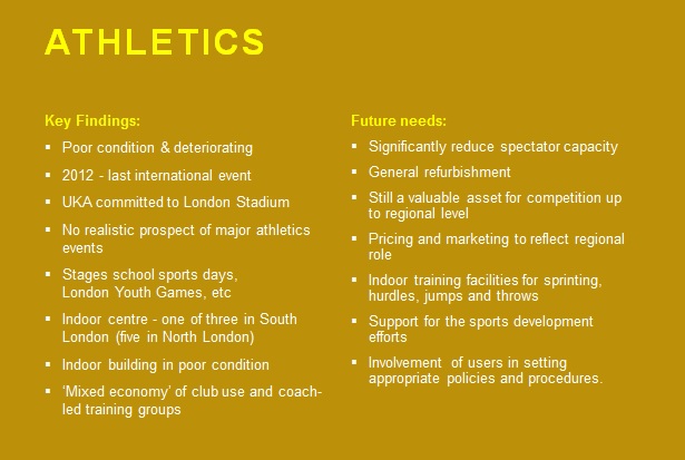 In a recent conversation between the GLA and our CPSP Chair, they made it clear that without the engagement of National Governing Bodies (NGB’s) it was going to be very difficult to make the case for retention of some facilities. The last CSM study into the NSC is still referred to, but we think this is somewhat historic in value and relevance now. The CSM report lacked robust data usage and strategic needs assessment by sport.