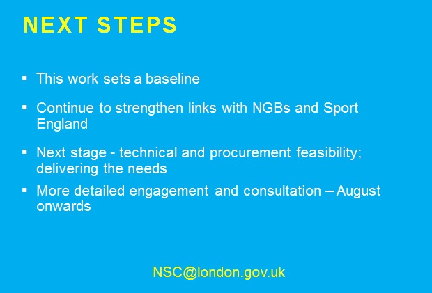 We are now approaching what could be another critical phase with the NSC planning by the GLA, where it will be crucial that NGB’s – especially for all outdoor sports generally, to engage at the highest level.