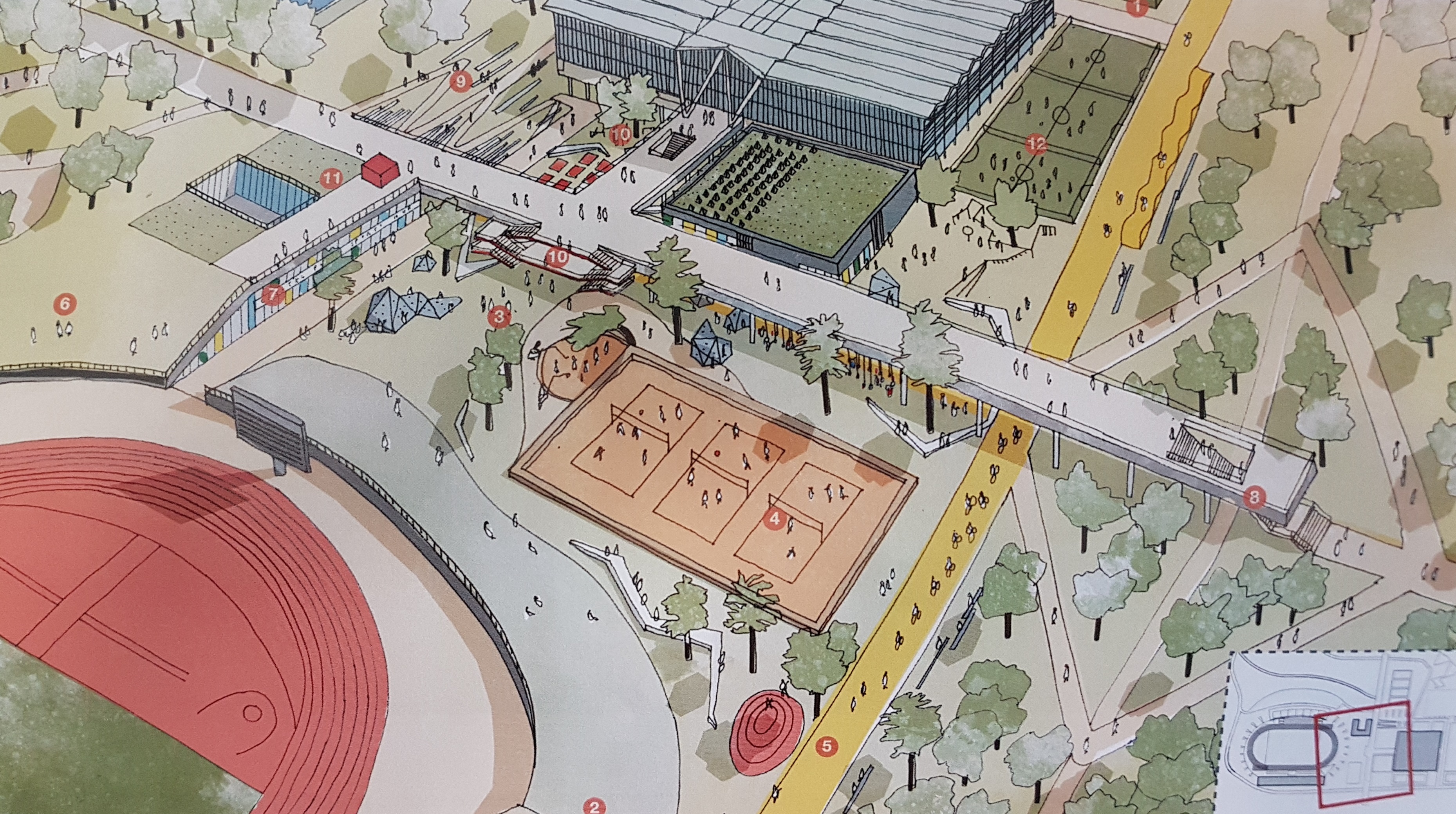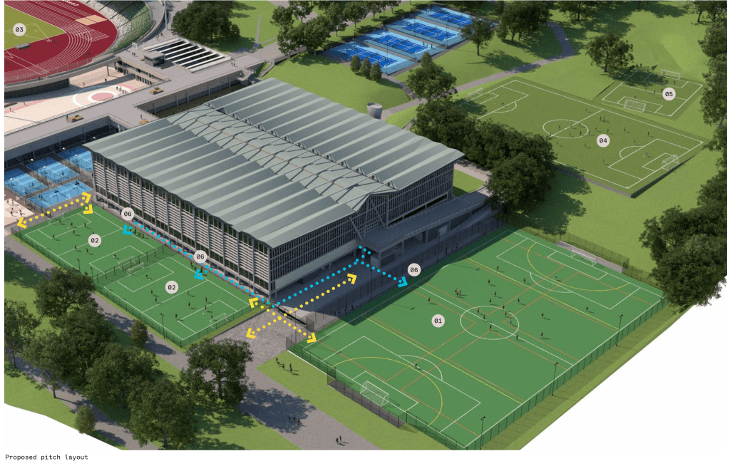- The creation of a six-court padel centre, 3×3 basketball courts, five-a-side football pitches and a full-size artificial multi-sports pitch