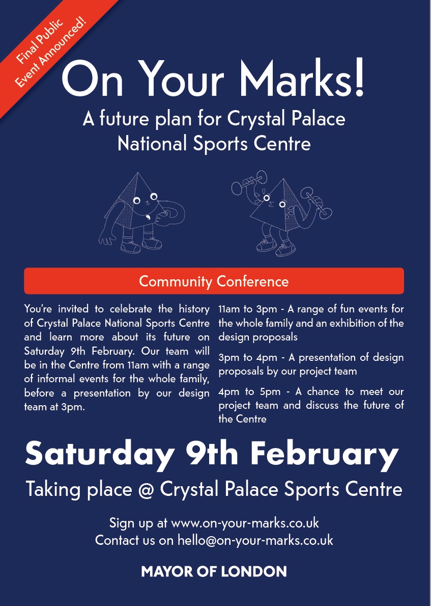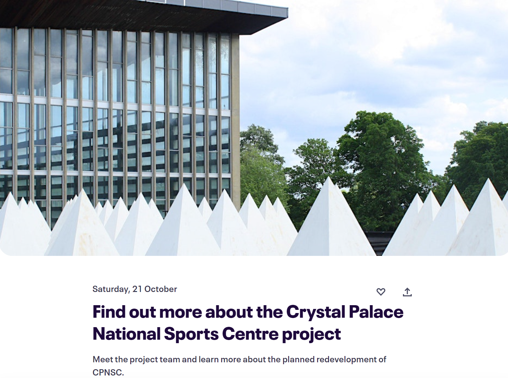 On Sat 21st October at 11am, at CP NSC Crystal Palace, meet the GLA project team and learn more about the planned redevelopment of CPNSC. Project update and presentation, followed by a Q+A. Also, there will be an informal drop-in session (reception area) 1pm to 2pm with no booking needed.