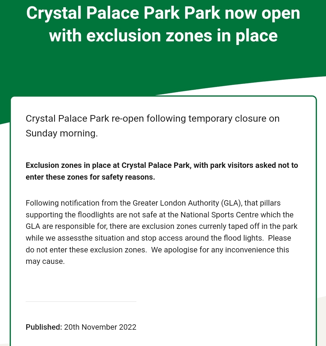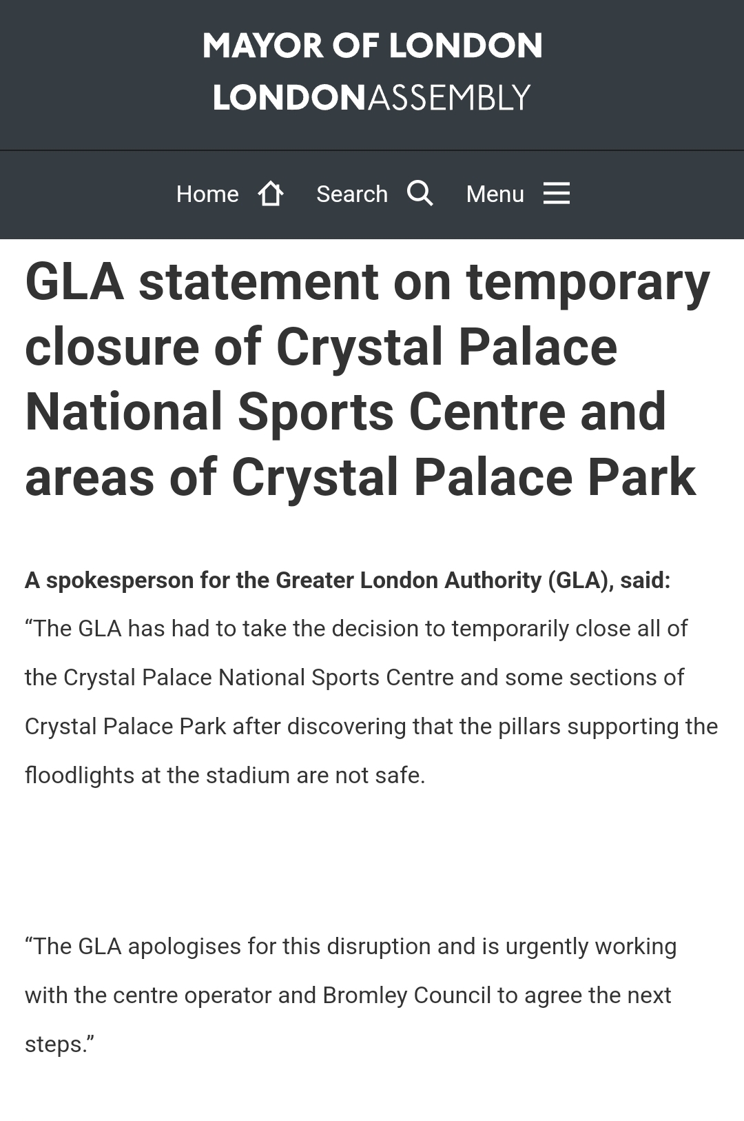 GLL alert “Crystal Palace National Sports Centre has temporarily closed today (Friday 18 November) after some sections of the pillars supporting the floodlights at the stadium were deemed unsafe... “
