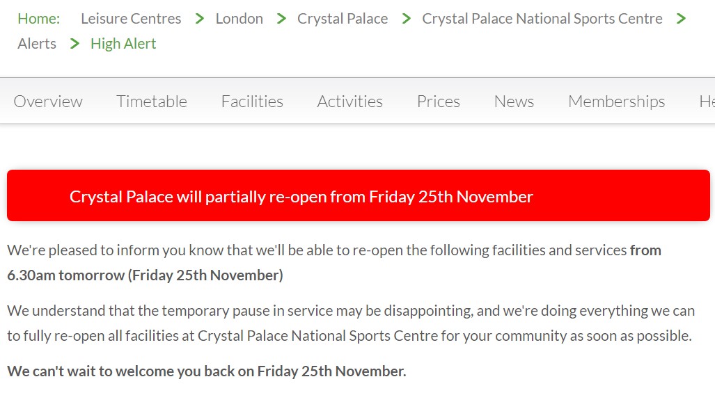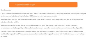 GLL Service update: “There is still some activities that are temporily paused, we are doing everything we can to resume all activities at Crystal Palace NSC for your community as soon as possible… While our team works to make the rest of the stadium safe once again, the outdoor track, indoor track and hockey pitch remains closed. Limited car parking will be available, customers are advised to use alternative means of transport if at all possible.” Latest GLL service updates check here.