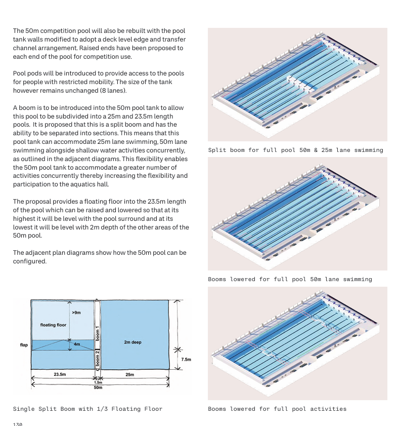 - A boom is to be introduced into the 50m pool tank to allow this pool to be subdivided into a 25m and 23.5m length. The split boom is shown as two booms, one longer boom and one shorter boom short for increased flexibility for 50m swimming. A floating floor in the 23.5m pool divided area can be raised and lowered so that at its highest it will be level with the pool surround and at its lowest it will be level with 2m depth of the other areas of the 50m pool.