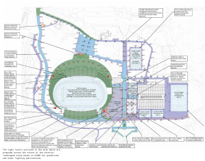 The new reconfigured stadium facilities would be located below ground taking advantage of the topography of the Park, with an accessible green roof, and with outside seating up to 3,000 spectators. The RSC has expected use as a large sports centre, indicative footprint 10,910-14,500 sqm. The car parking total was for up to 383 cars, integrated with tree planting to minimise the impact on the surrounding parkland, and with over-flow parking during major events. It is envisaged that the largest likely events at the Park would be held within the stadium area (for up to 30,000).