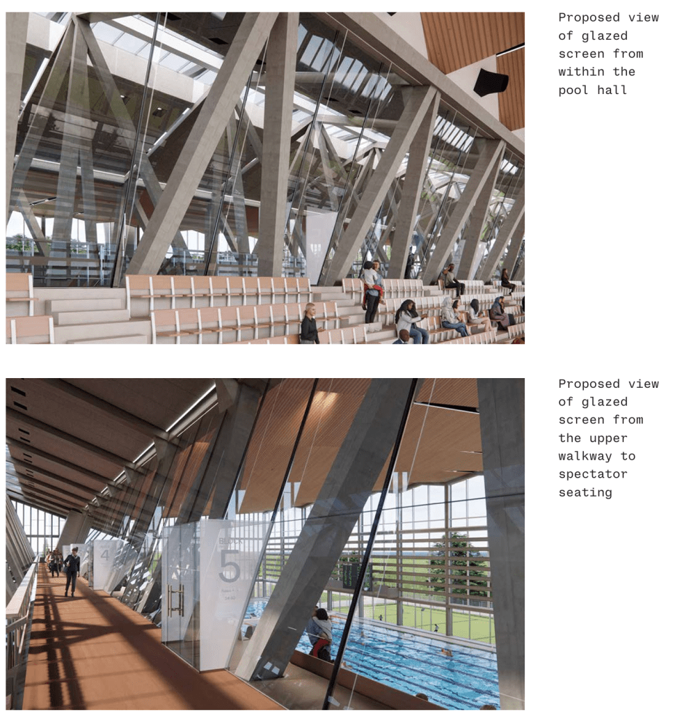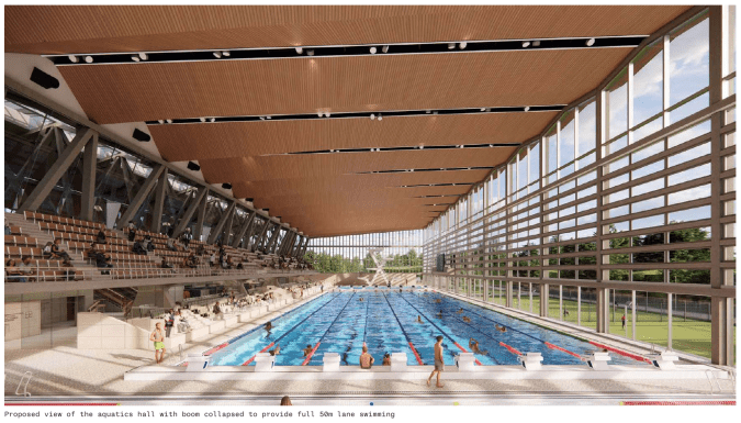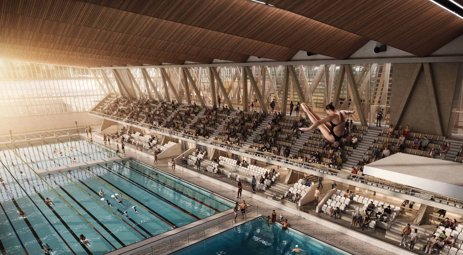 - Fully restoring the 10m diving pool, rebuilding the 50m swimming pool, and adding a new 25m pool inside the main pools area. The 50m and 25m pools become “deck level” (with water level raised to deck level), and the pools will be more flexible use (and keeping long course / 50m swimming).