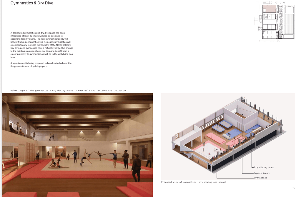 - Enlarged main gym and new dedicated spaces for sporting clubs, new dedicated gymnastics and dry diving facilities.