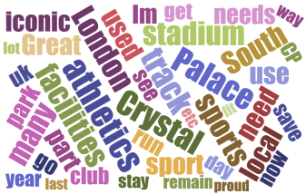 James Elton, London England: London is already short of top class sporting facilities and in light of the growing population there should be more and not less. Crystal Palace has a great tradition and is a resource we all rely on.